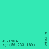 Цвет #32E9B4 в цветовой модели RGB обозначается тремя октетами (50, 233, 180) в десятичном формате и #32E9B4 в шестнадцатиричном (hex) формате, которые являются интенсивностью красного 50 (hex 32), интенсивность зелёного 233 (hex E9) и интенсивность синего 180 (hex B4).