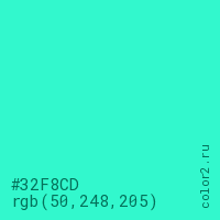 Цвет #32F8CD в цветовой модели RGB обозначается тремя октетами (50, 248, 205) в десятичном формате и #32F8CD в шестнадцатиричном (hex) формате, которые являются интенсивностью красного 50 (hex 32), интенсивность зелёного 248 (hex F8) и интенсивность синего 205 (hex CD).