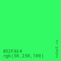 Цвет #32FA64 в цветовой модели RGB обозначается тремя октетами (50, 250, 100) в десятичном формате и #32FA64 в шестнадцатиричном (hex) формате, которые являются интенсивностью красного 50 (hex 32), интенсивность зелёного 250 (hex FA) и интенсивность синего 100 (hex 64).