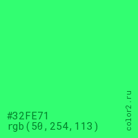 Цвет #32FE71 в цветовой модели RGB обозначается тремя октетами (50, 254, 113) в десятичном формате и #32FE71 в шестнадцатиричном (hex) формате, которые являются интенсивностью красного 50 (hex 32), интенсивность зелёного 254 (hex FE) и интенсивность синего 113 (hex 71).
