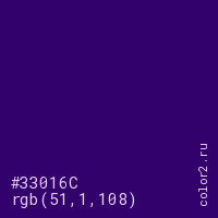 Цвет #33016C в цветовой модели RGB обозначается тремя октетами (51, 1, 108) в десятичном формате и #33016C в шестнадцатиричном (hex) формате, которые являются интенсивностью красного 51 (hex 33), интенсивность зелёного 1 (hex 01) и интенсивность синего 108 (hex 6C).