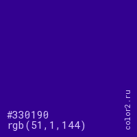 Цвет #330190 в цветовой модели RGB обозначается тремя октетами (51, 1, 144) в десятичном формате и #330190 в шестнадцатиричном (hex) формате, которые являются интенсивностью красного 51 (hex 33), интенсивность зелёного 1 (hex 01) и интенсивность синего 144 (hex 90).