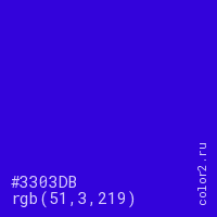 Цвет #3303DB в цветовой модели RGB обозначается тремя октетами (51, 3, 219) в десятичном формате и #3303DB в шестнадцатиричном (hex) формате, которые являются интенсивностью красного 51 (hex 33), интенсивность зелёного 3 (hex 03) и интенсивность синего 219 (hex DB).