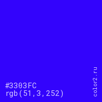 Цвет #3303FC в цветовой модели RGB обозначается тремя октетами (51, 3, 252) в десятичном формате и #3303FC в шестнадцатиричном (hex) формате, которые являются интенсивностью красного 51 (hex 33), интенсивность зелёного 3 (hex 03) и интенсивность синего 252 (hex FC).