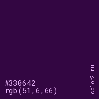 Цвет #330642 в цветовой модели RGB обозначается тремя октетами (51, 6, 66) в десятичном формате и #330642 в шестнадцатиричном (hex) формате, которые являются интенсивностью красного 51 (hex 33), интенсивность зелёного 6 (hex 06) и интенсивность синего 66 (hex 42).
