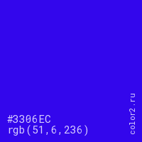 Цвет #3306EC в цветовой модели RGB обозначается тремя октетами (51, 6, 236) в десятичном формате и #3306EC в шестнадцатиричном (hex) формате, которые являются интенсивностью красного 51 (hex 33), интенсивность зелёного 6 (hex 06) и интенсивность синего 236 (hex EC).