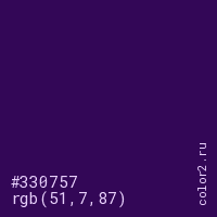 Цвет #330757 в цветовой модели RGB обозначается тремя октетами (51, 7, 87) в десятичном формате и #330757 в шестнадцатиричном (hex) формате, которые являются интенсивностью красного 51 (hex 33), интенсивность зелёного 7 (hex 07) и интенсивность синего 87 (hex 57).