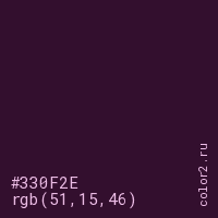 Цвет #330F2E в цветовой модели RGB обозначается тремя октетами (51, 15, 46) в десятичном формате и #330F2E в шестнадцатиричном (hex) формате, которые являются интенсивностью красного 51 (hex 33), интенсивность зелёного 15 (hex 0F) и интенсивность синего 46 (hex 2E).