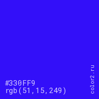 Цвет #330FF9 в цветовой модели RGB обозначается тремя октетами (51, 15, 249) в десятичном формате и #330FF9 в шестнадцатиричном (hex) формате, которые являются интенсивностью красного 51 (hex 33), интенсивность зелёного 15 (hex 0F) и интенсивность синего 249 (hex F9).