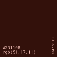 Цвет #33110B в цветовой модели RGB обозначается тремя октетами (51, 17, 11) в десятичном формате и #33110B в шестнадцатиричном (hex) формате, которые являются интенсивностью красного 51 (hex 33), интенсивность зелёного 17 (hex 11) и интенсивность синего 11 (hex 0B).