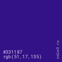 Цвет #331187 в цветовой модели RGB обозначается тремя октетами (51, 17, 135) в десятичном формате и #331187 в шестнадцатиричном (hex) формате, которые являются интенсивностью красного 51 (hex 33), интенсивность зелёного 17 (hex 11) и интенсивность синего 135 (hex 87).