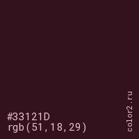 Цвет #33121D в цветовой модели RGB обозначается тремя октетами (51, 18, 29) в десятичном формате и #33121D в шестнадцатиричном (hex) формате, которые являются интенсивностью красного 51 (hex 33), интенсивность зелёного 18 (hex 12) и интенсивность синего 29 (hex 1D).