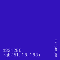 Цвет #3312BC в цветовой модели RGB обозначается тремя октетами (51, 18, 188) в десятичном формате и #3312BC в шестнадцатиричном (hex) формате, которые являются интенсивностью красного 51 (hex 33), интенсивность зелёного 18 (hex 12) и интенсивность синего 188 (hex BC).