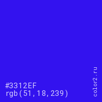 Цвет #3312EF в цветовой модели RGB обозначается тремя октетами (51, 18, 239) в десятичном формате и #3312EF в шестнадцатиричном (hex) формате, которые являются интенсивностью красного 51 (hex 33), интенсивность зелёного 18 (hex 12) и интенсивность синего 239 (hex EF).