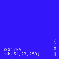 Цвет #3317FA в цветовой модели RGB обозначается тремя октетами (51, 23, 250) в десятичном формате и #3317FA в шестнадцатиричном (hex) формате, которые являются интенсивностью красного 51 (hex 33), интенсивность зелёного 23 (hex 17) и интенсивность синего 250 (hex FA).