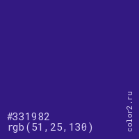 Цвет #331982 в цветовой модели RGB обозначается тремя октетами (51, 25, 130) в десятичном формате и #331982 в шестнадцатиричном (hex) формате, которые являются интенсивностью красного 51 (hex 33), интенсивность зелёного 25 (hex 19) и интенсивность синего 130 (hex 82).
