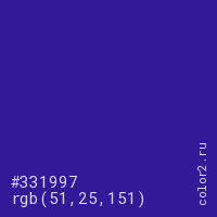 Цвет #331997 в цветовой модели RGB обозначается тремя октетами (51, 25, 151) в десятичном формате и #331997 в шестнадцатиричном (hex) формате, которые являются интенсивностью красного 51 (hex 33), интенсивность зелёного 25 (hex 19) и интенсивность синего 151 (hex 97).