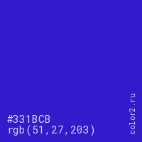 Цвет #331BCB в цветовой модели RGB обозначается тремя октетами (51, 27, 203) в десятичном формате и #331BCB в шестнадцатиричном (hex) формате, которые являются интенсивностью красного 51 (hex 33), интенсивность зелёного 27 (hex 1B) и интенсивность синего 203 (hex CB).