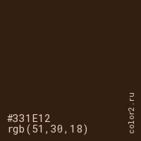 Цвет #331E12 в цветовой модели RGB обозначается тремя октетами (51, 30, 18) в десятичном формате и #331E12 в шестнадцатиричном (hex) формате, которые являются интенсивностью красного 51 (hex 33), интенсивность зелёного 30 (hex 1E) и интенсивность синего 18 (hex 12).