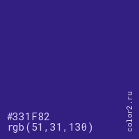 Цвет #331F82 в цветовой модели RGB обозначается тремя октетами (51, 31, 130) в десятичном формате и #331F82 в шестнадцатиричном (hex) формате, которые являются интенсивностью красного 51 (hex 33), интенсивность зелёного 31 (hex 1F) и интенсивность синего 130 (hex 82).
