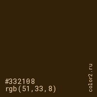 Цвет #332108 в цветовой модели RGB обозначается тремя октетами (51, 33, 8) в десятичном формате и #332108 в шестнадцатиричном (hex) формате, которые являются интенсивностью красного 51 (hex 33), интенсивность зелёного 33 (hex 21) и интенсивность синего 8 (hex 08).