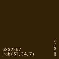 Цвет #332207 в цветовой модели RGB обозначается тремя октетами (51, 34, 7) в десятичном формате и #332207 в шестнадцатиричном (hex) формате, которые являются интенсивностью красного 51 (hex 33), интенсивность зелёного 34 (hex 22) и интенсивность синего 7 (hex 07).