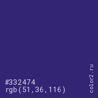 Цвет #332474 в цветовой модели RGB обозначается тремя октетами (51, 36, 116) в десятичном формате и #332474 в шестнадцатиричном (hex) формате, которые являются интенсивностью красного 51 (hex 33), интенсивность зелёного 36 (hex 24) и интенсивность синего 116 (hex 74).
