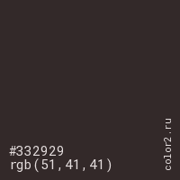 Цвет #332929 в цветовой модели RGB обозначается тремя октетами (51, 41, 41) в десятичном формате и #332929 в шестнадцатиричном (hex) формате, которые являются интенсивностью красного 51 (hex 33), интенсивность зелёного 41 (hex 29) и интенсивность синего 41 (hex 29).
