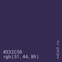 Цвет #332C50 в цветовой модели RGB обозначается тремя октетами (51, 44, 80) в десятичном формате и #332C50 в шестнадцатиричном (hex) формате, которые являются интенсивностью красного 51 (hex 33), интенсивность зелёного 44 (hex 2C) и интенсивность синего 80 (hex 50).
