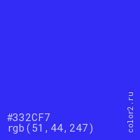 Цвет #332CF7 в цветовой модели RGB обозначается тремя октетами (51, 44, 247) в десятичном формате и #332CF7 в шестнадцатиричном (hex) формате, которые являются интенсивностью красного 51 (hex 33), интенсивность зелёного 44 (hex 2C) и интенсивность синего 247 (hex F7).