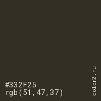 Цвет #332F25 в цветовой модели RGB обозначается тремя октетами (51, 47, 37) в десятичном формате и #332F25 в шестнадцатиричном (hex) формате, которые являются интенсивностью красного 51 (hex 33), интенсивность зелёного 47 (hex 2F) и интенсивность синего 37 (hex 25).