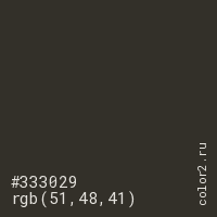 Цвет #333029 в цветовой модели RGB обозначается тремя октетами (51, 48, 41) в десятичном формате и #333029 в шестнадцатиричном (hex) формате, которые являются интенсивностью красного 51 (hex 33), интенсивность зелёного 48 (hex 30) и интенсивность синего 41 (hex 29).