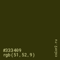 Цвет #333409 в цветовой модели RGB обозначается тремя октетами (51, 52, 9) в десятичном формате и #333409 в шестнадцатиричном (hex) формате, которые являются интенсивностью красного 51 (hex 33), интенсивность зелёного 52 (hex 34) и интенсивность синего 9 (hex 09).