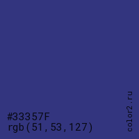 Цвет #33357F в цветовой модели RGB обозначается тремя октетами (51, 53, 127) в десятичном формате и #33357F в шестнадцатиричном (hex) формате, которые являются интенсивностью красного 51 (hex 33), интенсивность зелёного 53 (hex 35) и интенсивность синего 127 (hex 7F).
