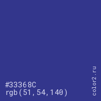 Цвет #33368C в цветовой модели RGB обозначается тремя октетами (51, 54, 140) в десятичном формате и #33368C в шестнадцатиричном (hex) формате, которые являются интенсивностью красного 51 (hex 33), интенсивность зелёного 54 (hex 36) и интенсивность синего 140 (hex 8C).