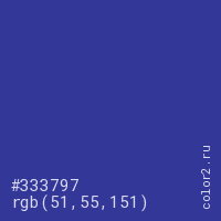 Цвет #333797 в цветовой модели RGB обозначается тремя октетами (51, 55, 151) в десятичном формате и #333797 в шестнадцатиричном (hex) формате, которые являются интенсивностью красного 51 (hex 33), интенсивность зелёного 55 (hex 37) и интенсивность синего 151 (hex 97).