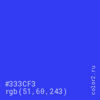 Цвет #333CF3 в цветовой модели RGB обозначается тремя октетами (51, 60, 243) в десятичном формате и #333CF3 в шестнадцатиричном (hex) формате, которые являются интенсивностью красного 51 (hex 33), интенсивность зелёного 60 (hex 3C) и интенсивность синего 243 (hex F3).