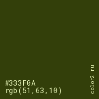 Цвет #333F0A в цветовой модели RGB обозначается тремя октетами (51, 63, 10) в десятичном формате и #333F0A в шестнадцатиричном (hex) формате, которые являются интенсивностью красного 51 (hex 33), интенсивность зелёного 63 (hex 3F) и интенсивность синего 10 (hex 0A).