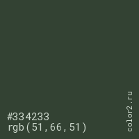Цвет #334233 в цветовой модели RGB обозначается тремя октетами (51, 66, 51) в десятичном формате и #334233 в шестнадцатиричном (hex) формате, которые являются интенсивностью красного 51 (hex 33), интенсивность зелёного 66 (hex 42) и интенсивность синего 51 (hex 33).