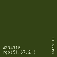 Цвет #334315 в цветовой модели RGB обозначается тремя октетами (51, 67, 21) в десятичном формате и #334315 в шестнадцатиричном (hex) формате, которые являются интенсивностью красного 51 (hex 33), интенсивность зелёного 67 (hex 43) и интенсивность синего 21 (hex 15).