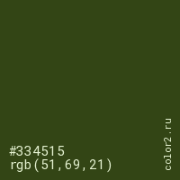 Цвет #334515 в цветовой модели RGB обозначается тремя октетами (51, 69, 21) в десятичном формате и #334515 в шестнадцатиричном (hex) формате, которые являются интенсивностью красного 51 (hex 33), интенсивность зелёного 69 (hex 45) и интенсивность синего 21 (hex 15).