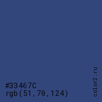 Цвет #33467C в цветовой модели RGB обозначается тремя октетами (51, 70, 124) в десятичном формате и #33467C в шестнадцатиричном (hex) формате, которые являются интенсивностью красного 51 (hex 33), интенсивность зелёного 70 (hex 46) и интенсивность синего 124 (hex 7C).