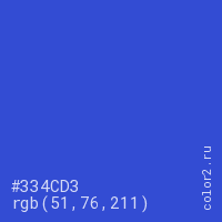 Цвет #334CD3 в цветовой модели RGB обозначается тремя октетами (51, 76, 211) в десятичном формате и #334CD3 в шестнадцатиричном (hex) формате, которые являются интенсивностью красного 51 (hex 33), интенсивность зелёного 76 (hex 4C) и интенсивность синего 211 (hex D3).