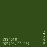 Цвет #334D18 в цветовой модели RGB обозначается тремя октетами (51, 77, 24) в десятичном формате и #334D18 в шестнадцатиричном (hex) формате, которые являются интенсивностью красного 51 (hex 33), интенсивность зелёного 77 (hex 4D) и интенсивность синего 24 (hex 18).