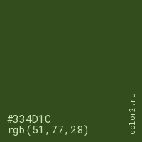 Цвет #334D1C в цветовой модели RGB обозначается тремя октетами (51, 77, 28) в десятичном формате и #334D1C в шестнадцатиричном (hex) формате, которые являются интенсивностью красного 51 (hex 33), интенсивность зелёного 77 (hex 4D) и интенсивность синего 28 (hex 1C).