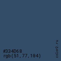 Цвет #334D68 в цветовой модели RGB обозначается тремя октетами (51, 77, 104) в десятичном формате и #334D68 в шестнадцатиричном (hex) формате, которые являются интенсивностью красного 51 (hex 33), интенсивность зелёного 77 (hex 4D) и интенсивность синего 104 (hex 68).