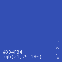 Цвет #334FB4 в цветовой модели RGB обозначается тремя октетами (51, 79, 180) в десятичном формате и #334FB4 в шестнадцатиричном (hex) формате, которые являются интенсивностью красного 51 (hex 33), интенсивность зелёного 79 (hex 4F) и интенсивность синего 180 (hex B4).