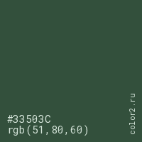 Цвет #33503C в цветовой модели RGB обозначается тремя октетами (51, 80, 60) в десятичном формате и #33503C в шестнадцатиричном (hex) формате, которые являются интенсивностью красного 51 (hex 33), интенсивность зелёного 80 (hex 50) и интенсивность синего 60 (hex 3C).