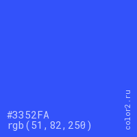 Цвет #3352FA в цветовой модели RGB обозначается тремя октетами (51, 82, 250) в десятичном формате и #3352FA в шестнадцатиричном (hex) формате, которые являются интенсивностью красного 51 (hex 33), интенсивность зелёного 82 (hex 52) и интенсивность синего 250 (hex FA).