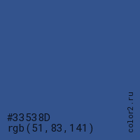Цвет #33538D в цветовой модели RGB обозначается тремя октетами (51, 83, 141) в десятичном формате и #33538D в шестнадцатиричном (hex) формате, которые являются интенсивностью красного 51 (hex 33), интенсивность зелёного 83 (hex 53) и интенсивность синего 141 (hex 8D).